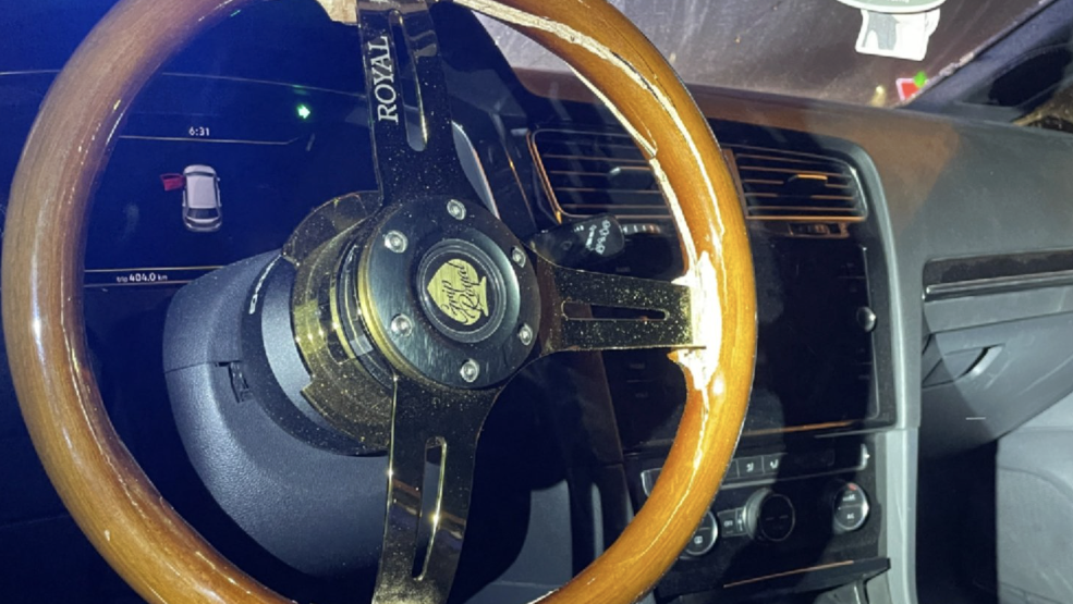 The image from the scene focuses tightly on the vehicle’s interior, drawing attention to the steering wheel and instrument cluster—an intimate snapshot of what can become a split-second emergency. The steering wheel appears to be an aftermarket model with a wooden rim and visible damage: the wood looks chipped or splintered, suggesting a forceful strike point consistent with police claims that the driver’s head hit the wheel.